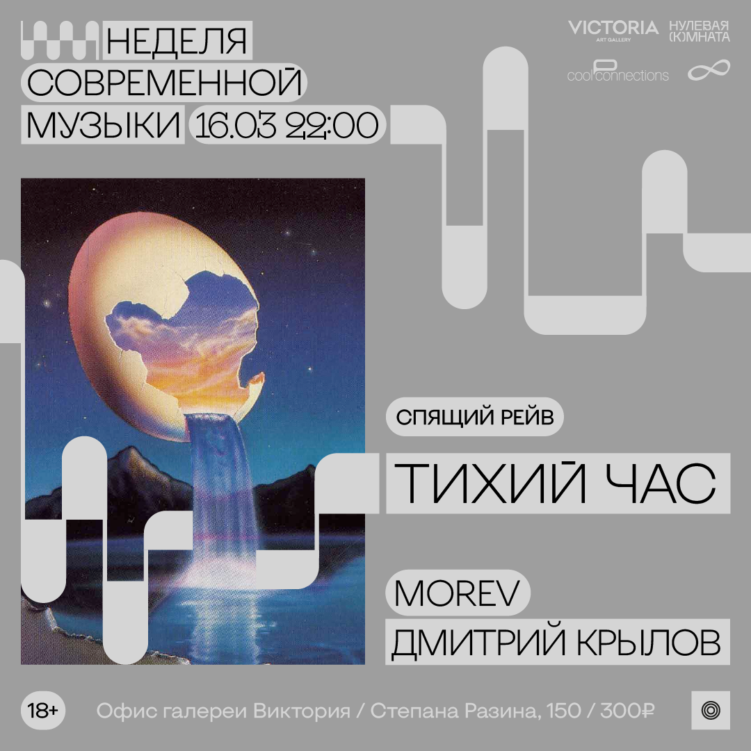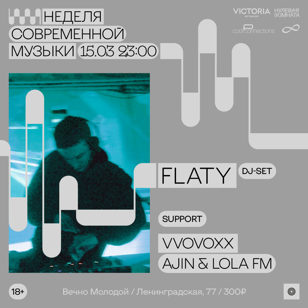 | | Flaty (DJ-set) | | В рамках «Недели современной музыки» в бар «Вечно молодой» приезжает Евгений Фадеев, также известный как Flaty — электронный музыкант, рекорд-продюсер и аудиовизуальный художник из Москвы. | | | | | | Спящий рейв «Тихий час»: Morev (live), Дмитрий Крылов | | Спать во время тусовки звучит как нонсенс, не правда ли? Однако уже как минимум 10 лет энтузиасты со всего мира практикуют так называемые эмбиент рейвы. Изначально они возникли как шутка о вечеринке с ночевкой, но впоследствии этот формат стал популярным во всей Европе. | | | | | | |