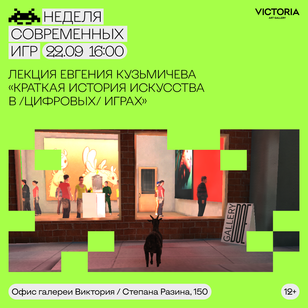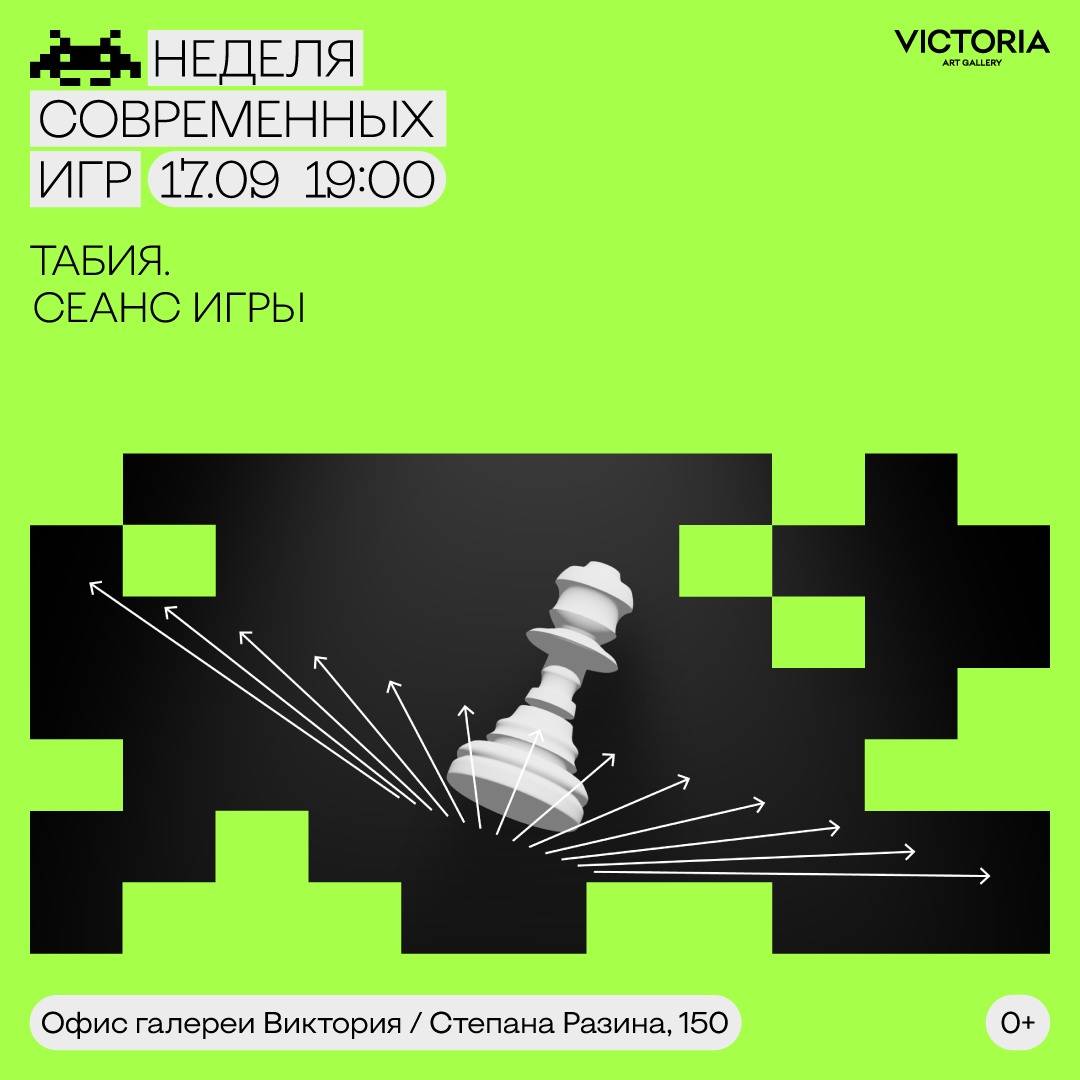 | | «Неделя современных игр» в Самаре от галереи «Виктория» | | Шахматный перформанс от самарских художников, лекции Антона Польского (Москва) и Евгения Кузьмичева (Санкт-Петербург) о настольных и компьютерных играх как формах или объектах исследования, документальный фильм о видеоигре, основанной на истории реальной семьи и открытие выставки в Музее Модерна! 17-22 сентября | | | | | | | | | 17 сентября, 19:00 Табия. Сеанс игры | | Событие, открывающее Неделю игр - презентация игры- произведения самарских художников Никиты Кузнецова, Ильи Михеева и Кирилла Ермолина-Луговского. | | | | | | 21 сентября, 16:00 Открытие выставки «Новый символизм: Гиперборея и киберпространство» | | Музей Модерна и галерея «Виктория» представляют выставку, посвященную символистической поэтике в современном искусстве. Выставка включает в себя произведения четырнадцати самарских, петербургский, нижегородских и московских авторов, которые в своих работах используют опыт символизма и игр, описывая трансцендентный мир, полный маршрутов и порталов. | | | | | | |